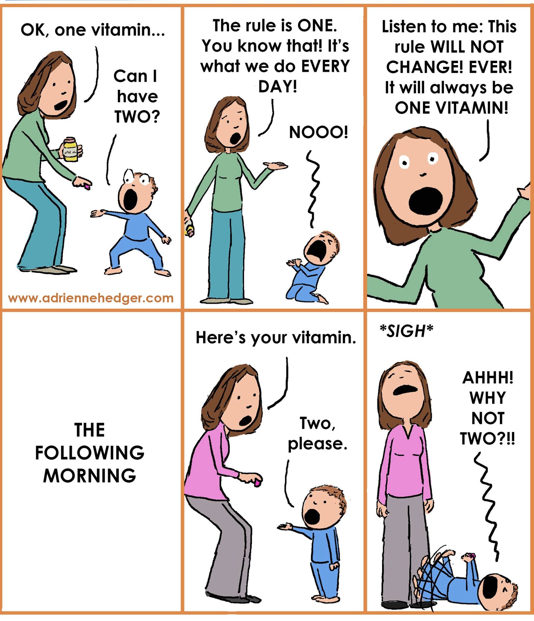 This cartoon was right on, actually a daily occurrence between my son and my husband. Toddlers have lots of energy and can spend a lot of it testing you. However, I do see small breakthroughs when I see him stopping himself from crying or acknowledging that he cried and won’t next time (even though he most probably will). So it’s not to say that if you stay consistent they will stop testing you, because they will. But I find they try for shorter as they know the outcome.